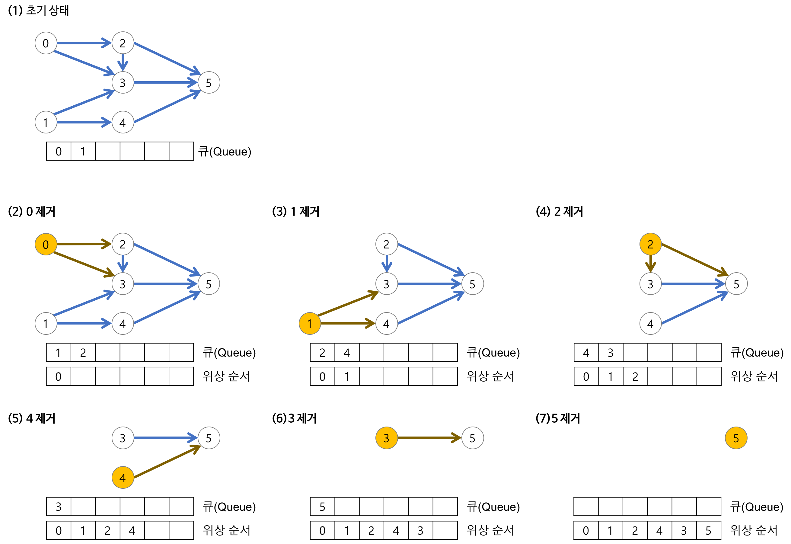 이 상태에서 위상 정렬 알고리즘은 진입 차수가 0인(선제 조건이 없거나, 이미 만족한) 노드를 하나씩 제거하며 정렬을 수행한다.